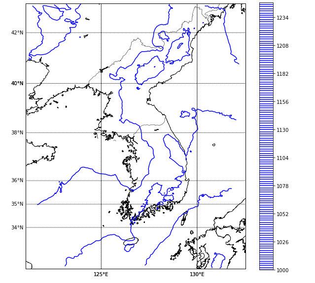 levels = np. arange(1000,1250,2), colors= "blue") # 한반도데이터로 압력변화가 작게 나타나