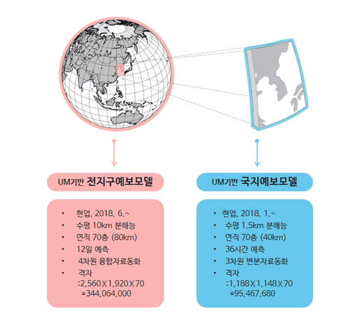 국지예보모델(UM 1.5kmL70)의 공간 해상도는 1.5km이며, 연직으로 약 40km까지 70층으로 구성되며, 3시간 간격으로 전지구모델로부터 경계장을 제공받아 1일 8회(00, 06, 12, 18UTC : 36시간 예측, 03, 09, 15, 18UTC : 3시간 예측) 수행함