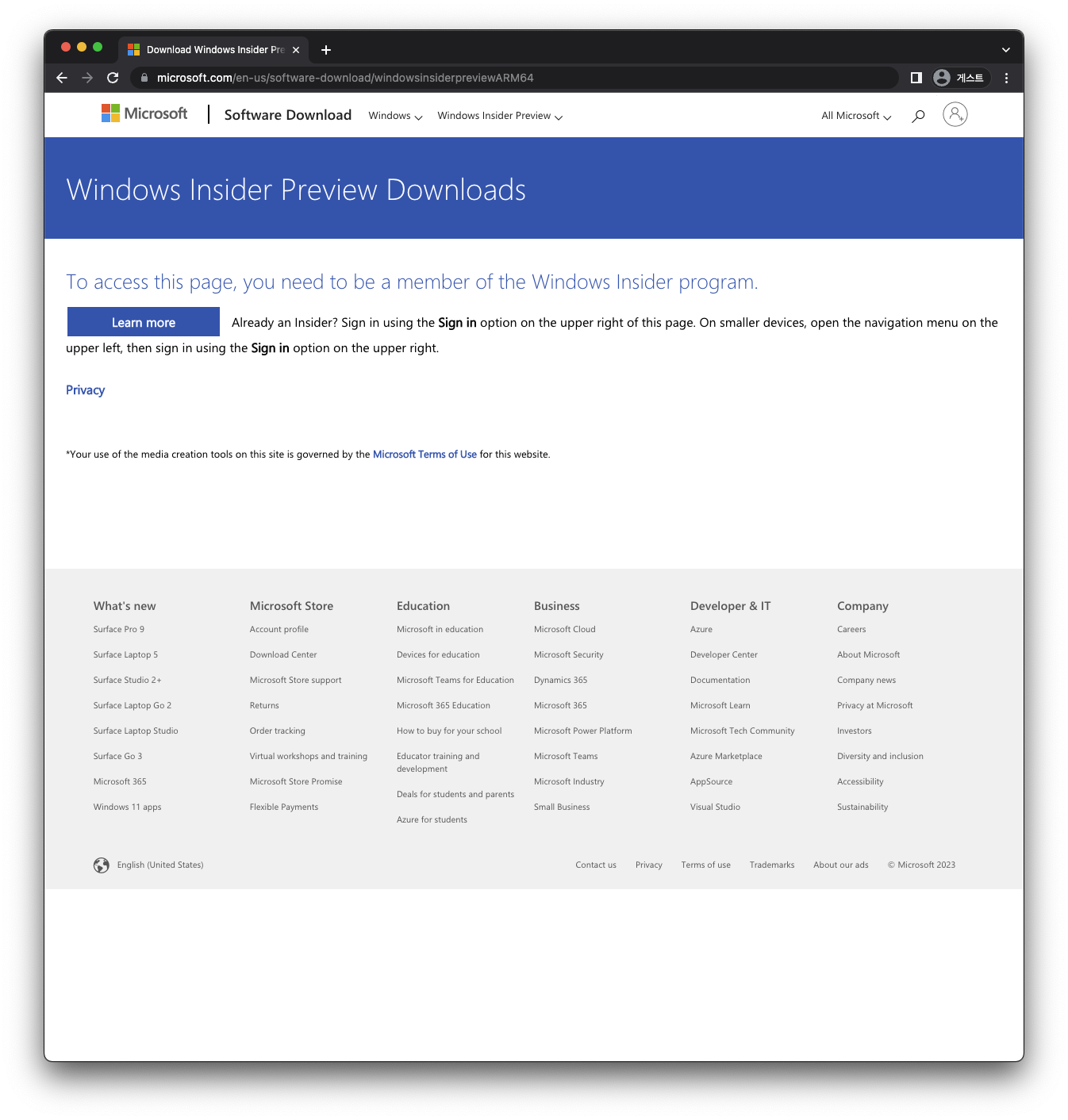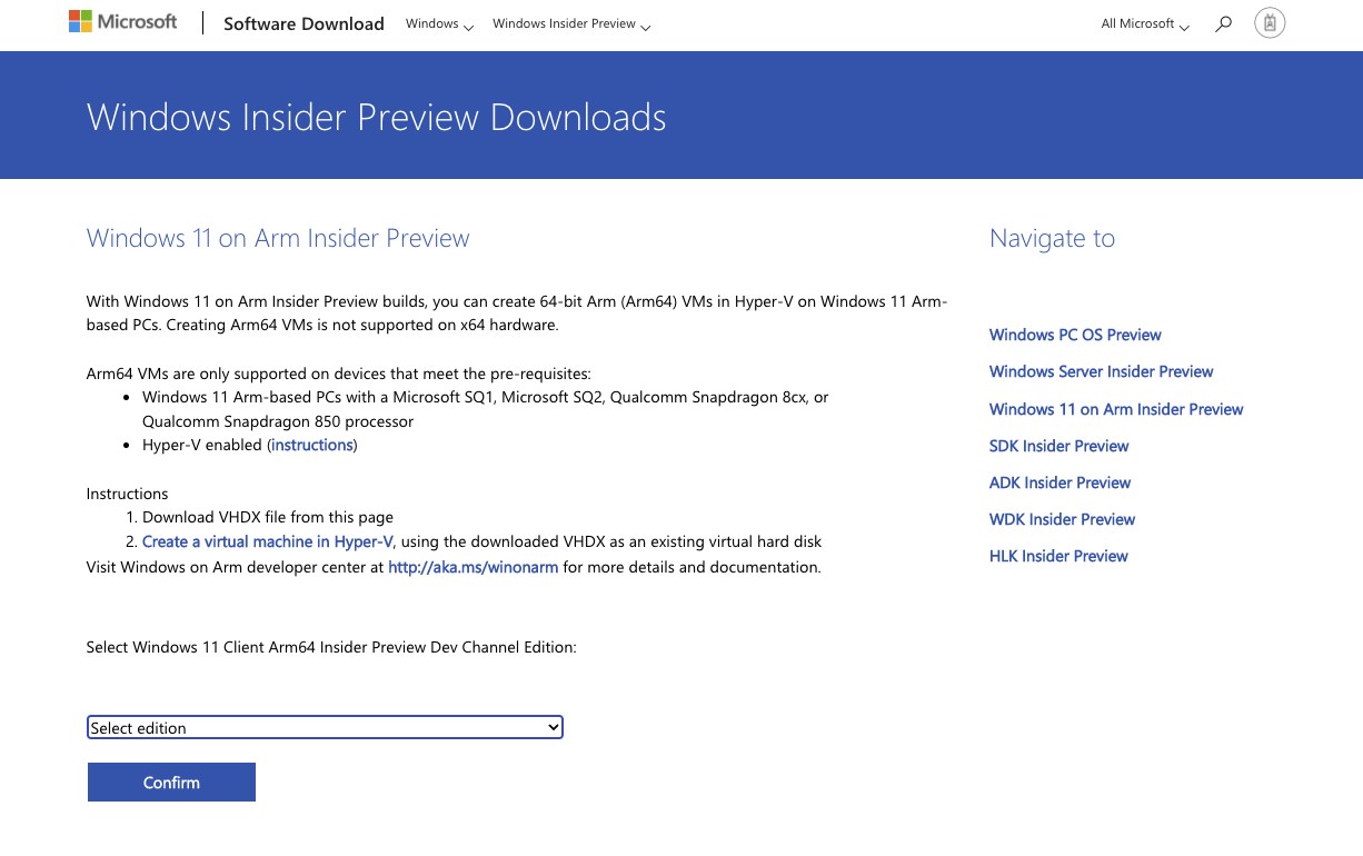- 다운로드 링크 : https://www.microsoft.com/en-us/software-download/windowsinsiderpreviewARM64