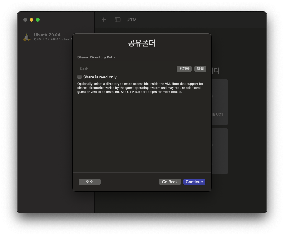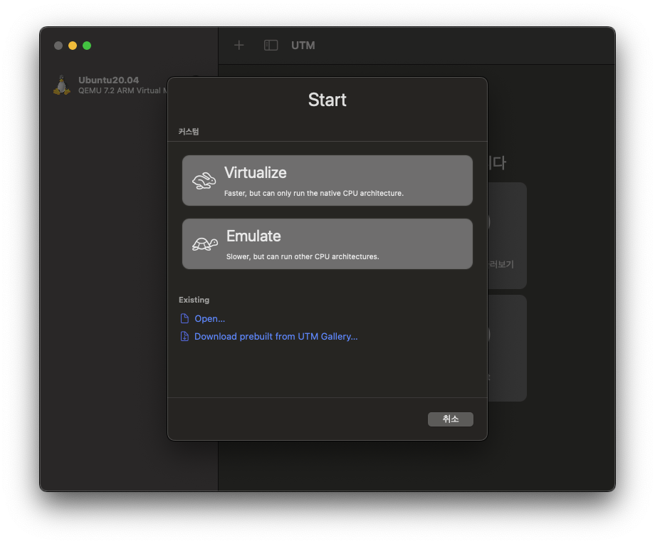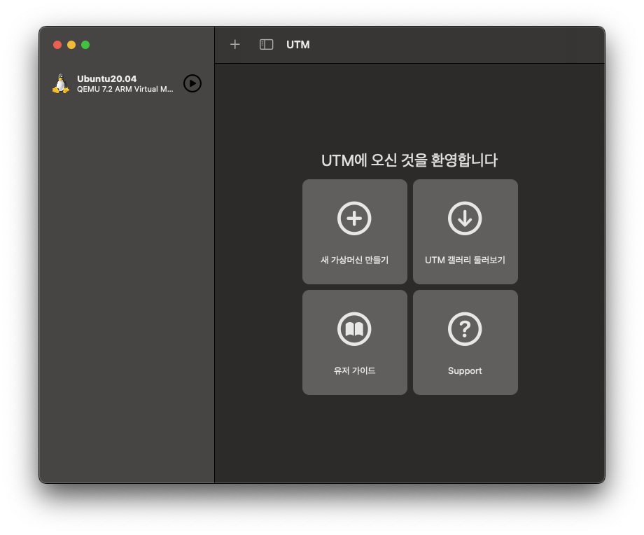 이전 포스팅에서 설치한 UTM을 실행시켜 "새 가상머신 만들기" 버튼을 클릭해 줍니다