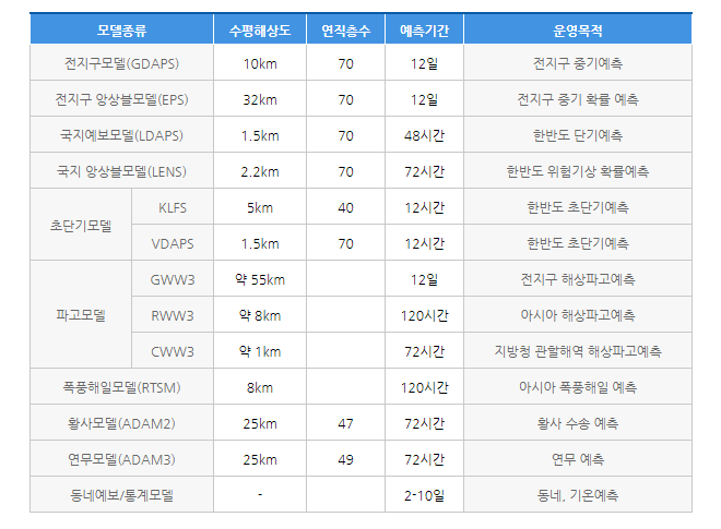 수치예보모델 종류 (출처: 기상청 수치모델관리실)