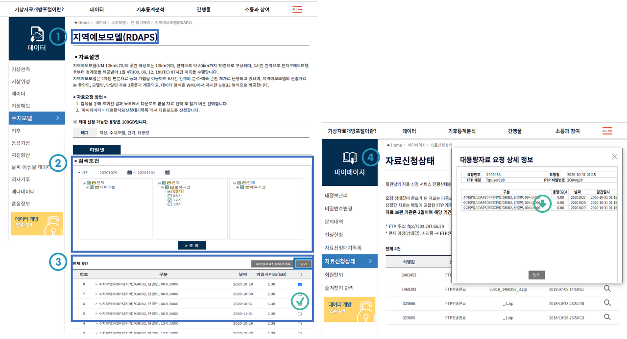 : 수치모델자료는 기상자료개방포털에서 다운로드할 수 있으며, 그 방법은 자신이 원하는 데이터를 조회하여 담은 뒤(①~③), 마이페이지에서 자료를 신청하면, E-mail이나 SNS로 FTP계정의 일시적인 ID/PW를 부여 받음