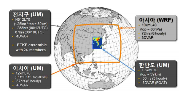 국지예보모델(UM 1.5kmL70)의 공간 해상도는 1.5km이며, 연직으로 약 40km까지 70층으로 구성되며, 3시간 간격으로 전지구모델로부터 경계장을 제공받아 1일 8회(00, 06, 12, 18UTC : 36시간 예측, 03, 09, 15, 18UTC : 3시간 예측) 수행함