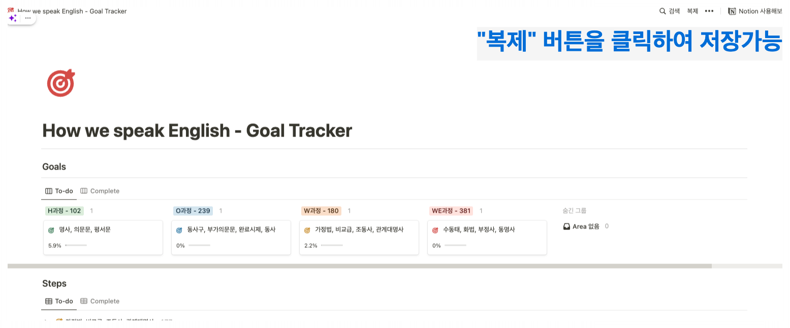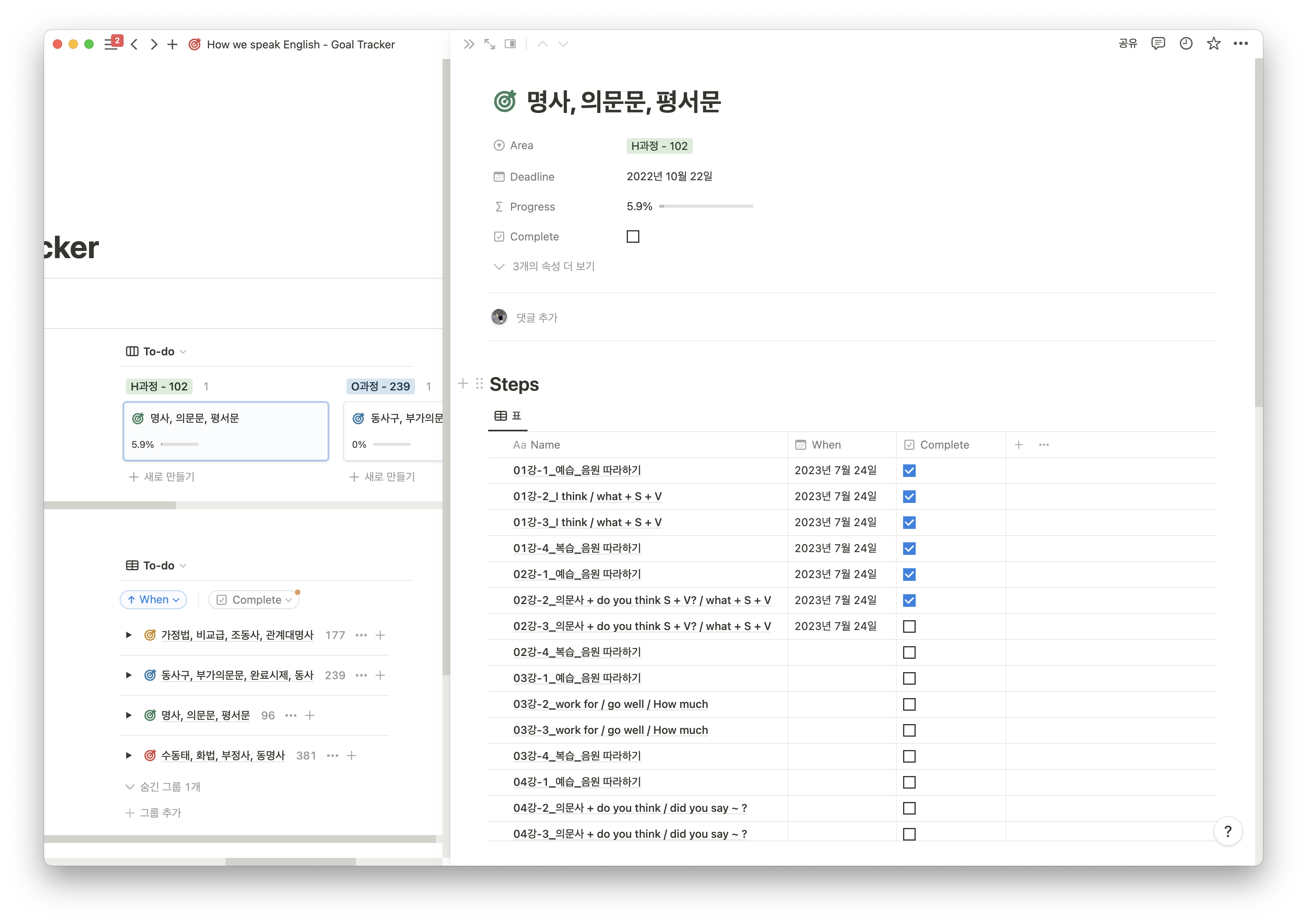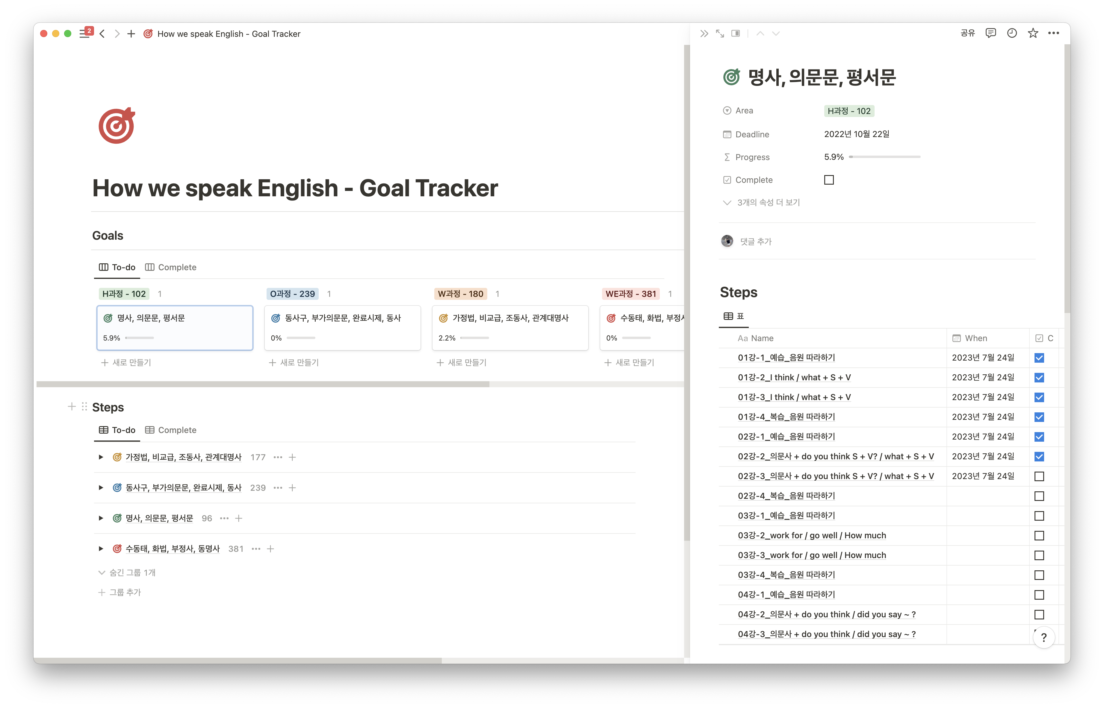 각 과정의 진행률을 파악할 수 있는 To-do 형태와 각각 강의의 내용을 정리할 수 있는 페이지로 구성되어있습니다.