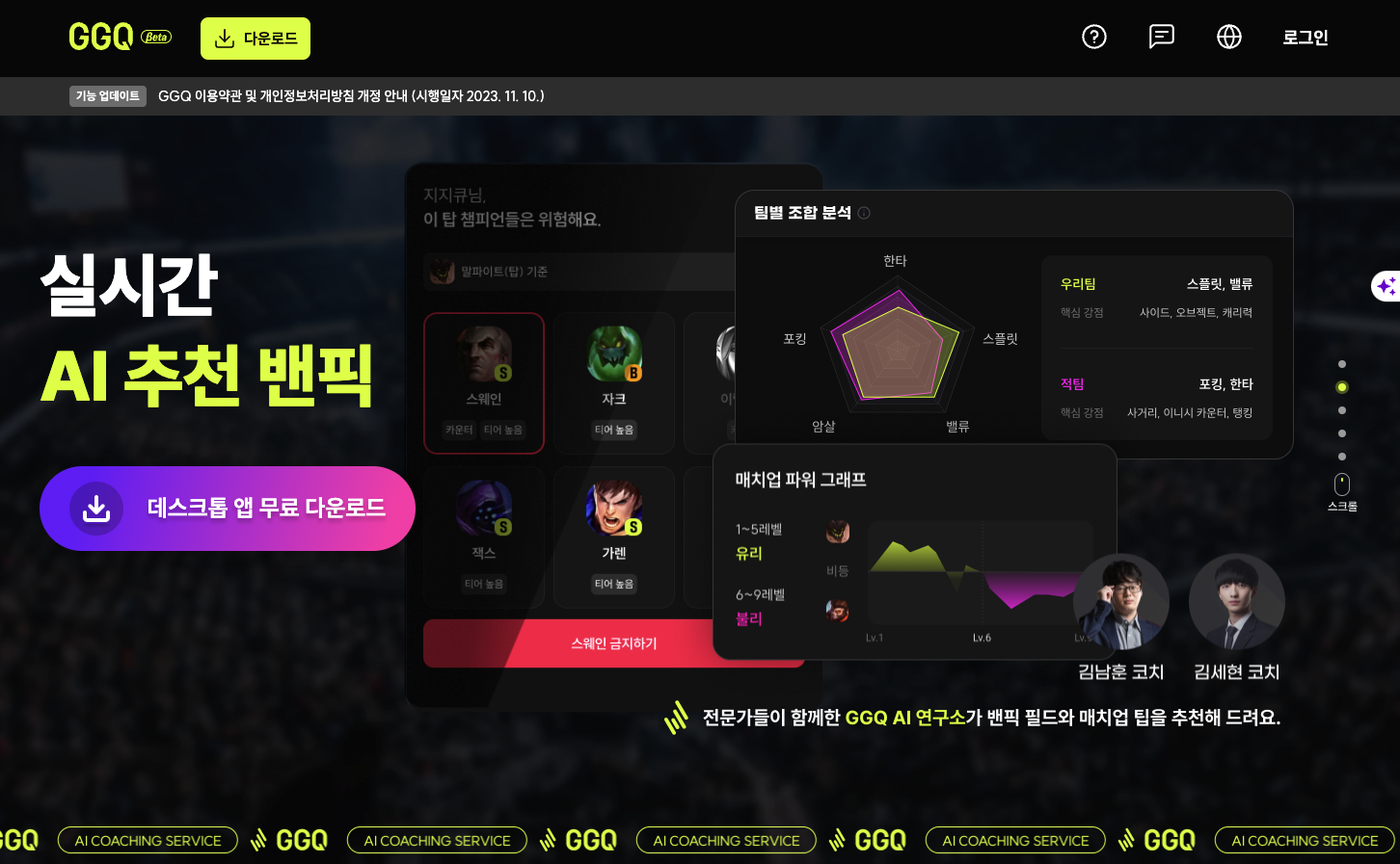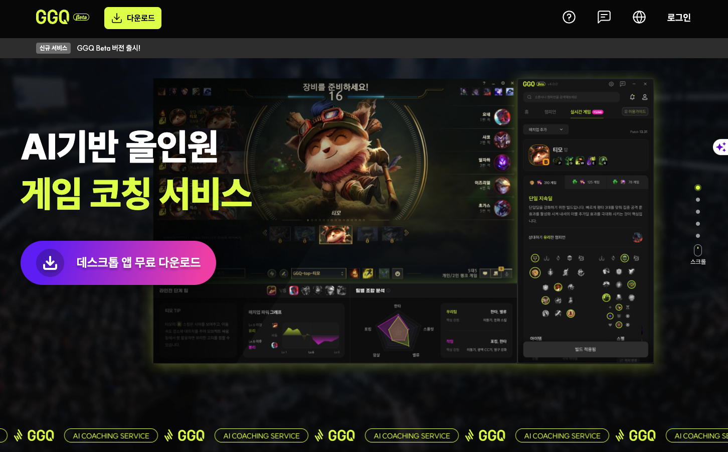 그럼, 본격적으로 롤 AI 코칭서비스, GGQ 소개하도록 하겠습니다. 해당 화면은 홈페이지 캡처화면입니다.