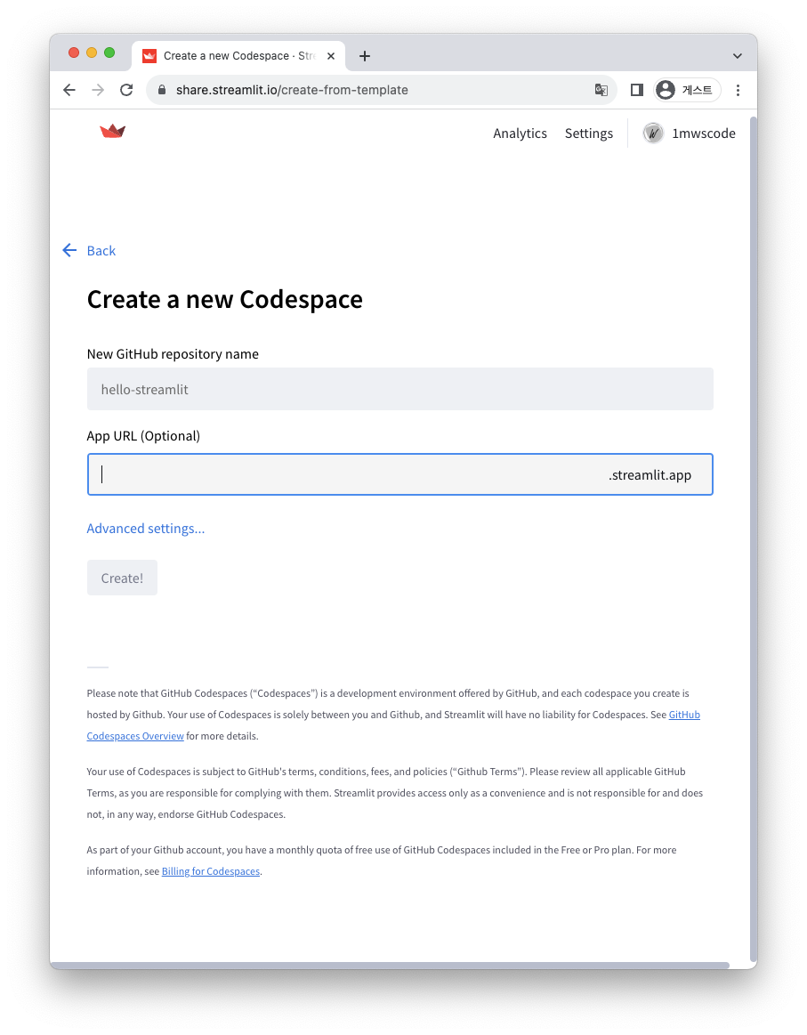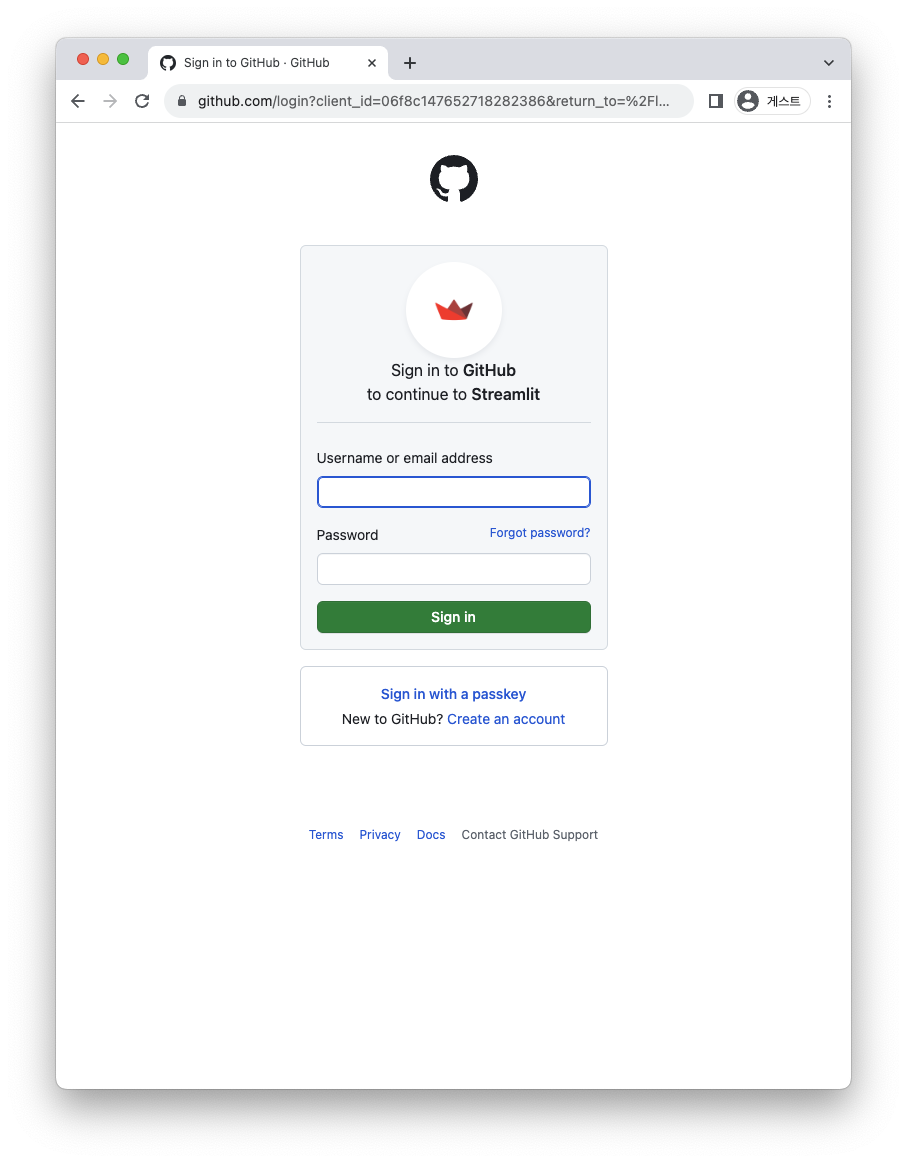 Streamlit sharing 사이트에 접속하여 본인의 github 계정을 연동합니다.