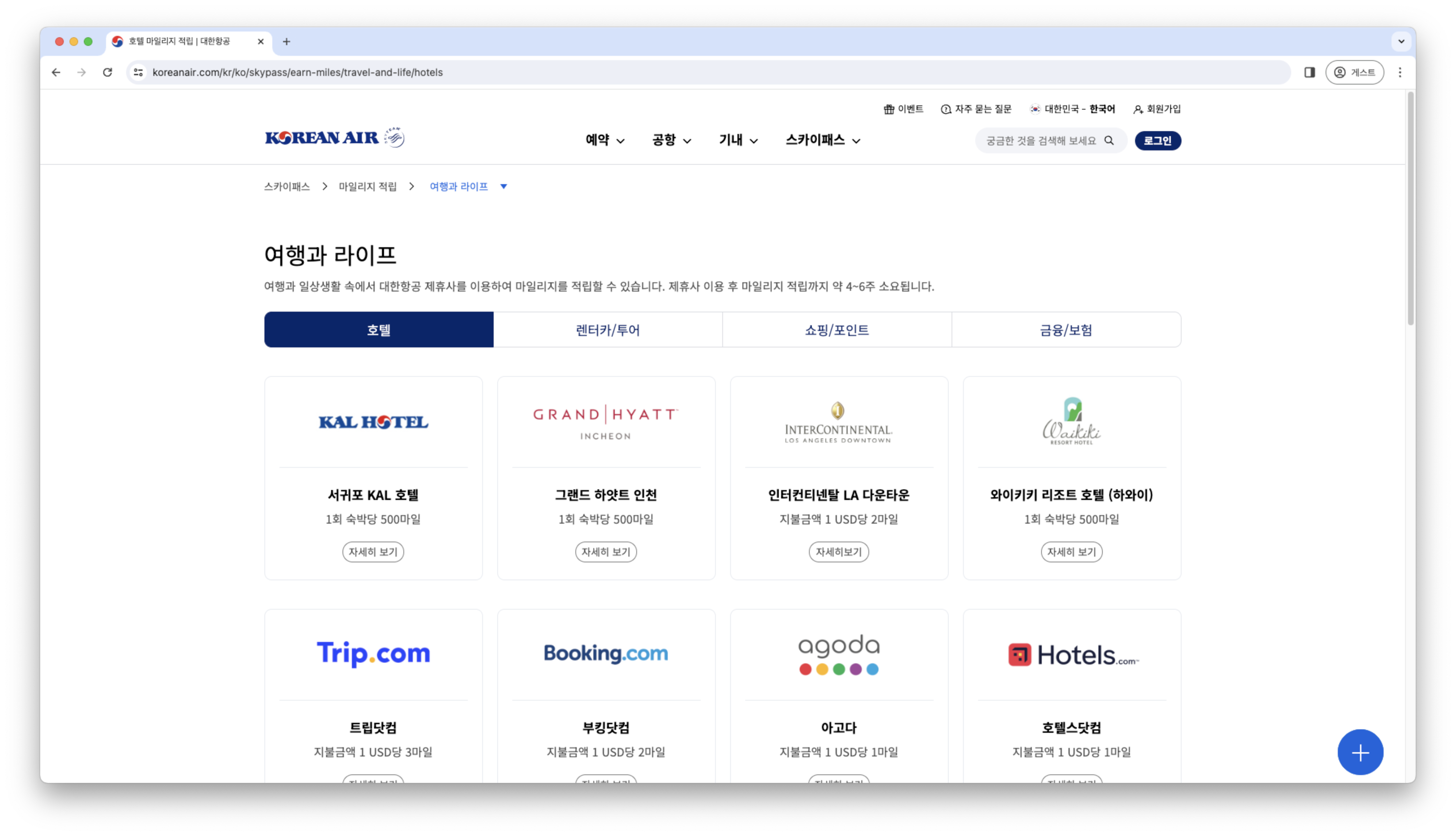 여행과 일상생활 속에서 대한항공 제휴사를 이용하여 마일리지를 적립할 수 있습니다.