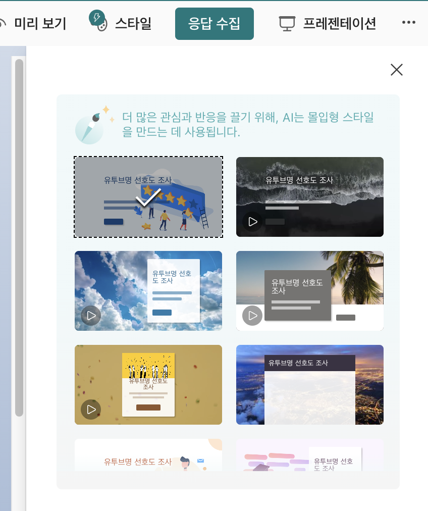 설문조사 내용도 중요하지만, 디자인도 그 못지않게 중요합니다. 하지만, 설문조사지 내용 작성하기도 바쁜데 언제 디자인까지 고민할 시간이 어디 있습니까... 하지만, 다행히도 Microsoft Forms에는 생성형 AI 기능으로 원하는 색상 및 원하는 디자인을 선택하여 편하게 생성이 가능합니다. 여러 가지를 클릭해 보면서 가장 적합한 것으로 설정이 가능합니다.