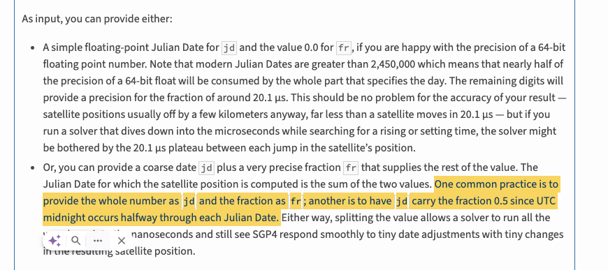 이 방식으로 Julian Date를 정수 부분과 소수 부분으로 나누어 사용하면, UTC 자정을 기준으로 정확하게 날짜와 시간을 계산할 수 있습니다. 계산의 편의성을 위해 기준을 잡는 거를 확인할 수 있습니다!