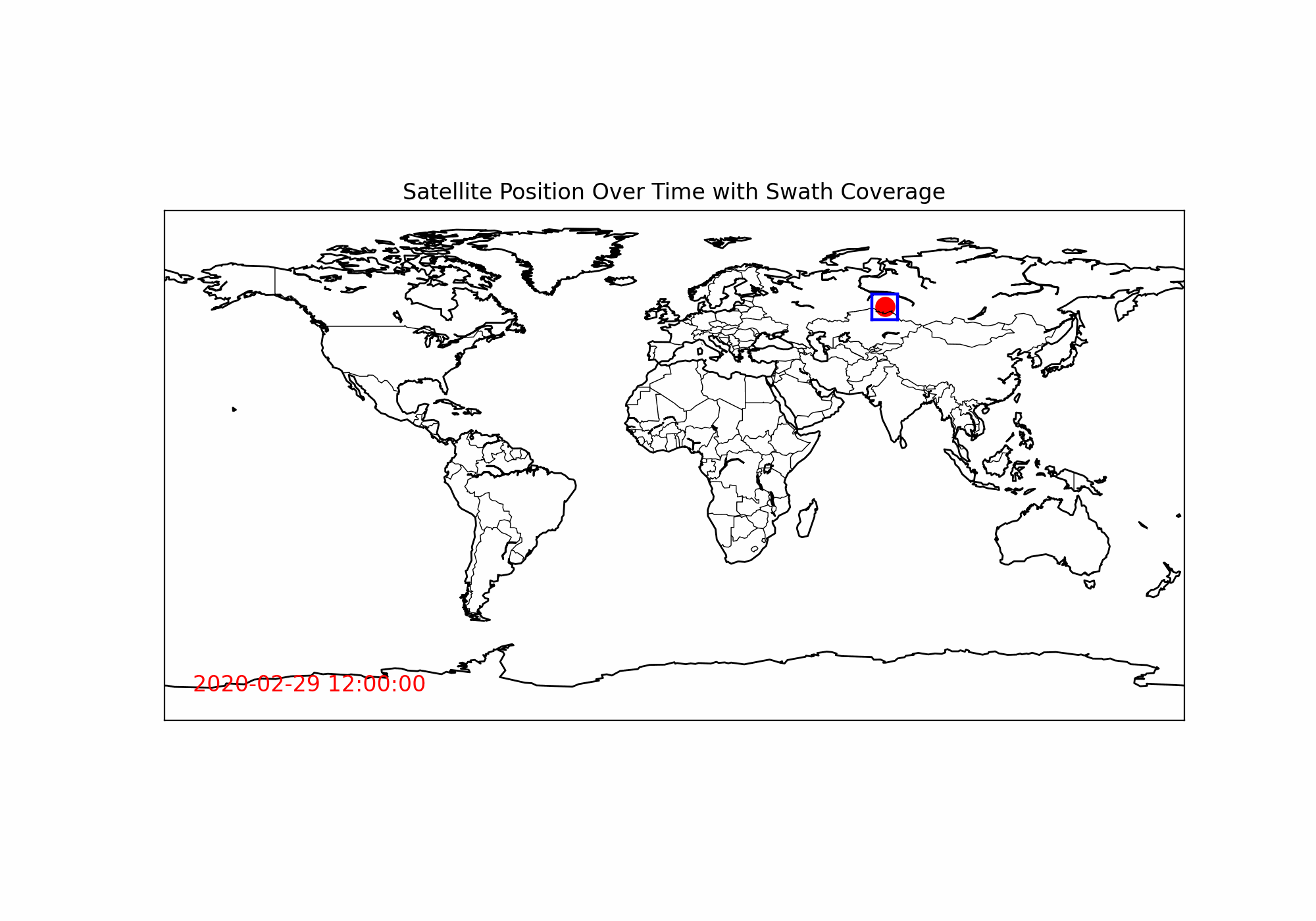 ani.save('./Result/Satellite Position Over Time with Swath Coverage.gif', writer='pillow', fps=5)