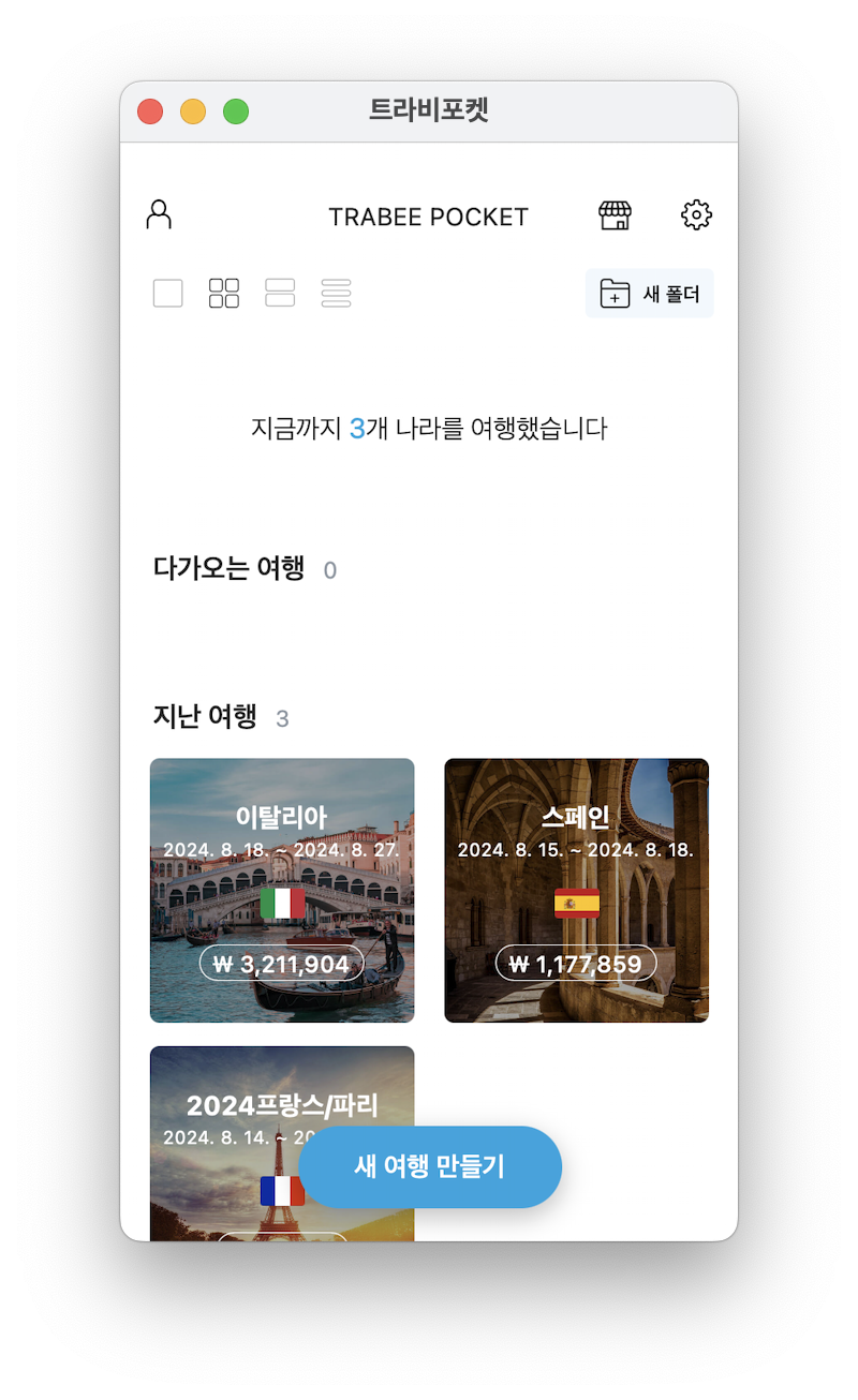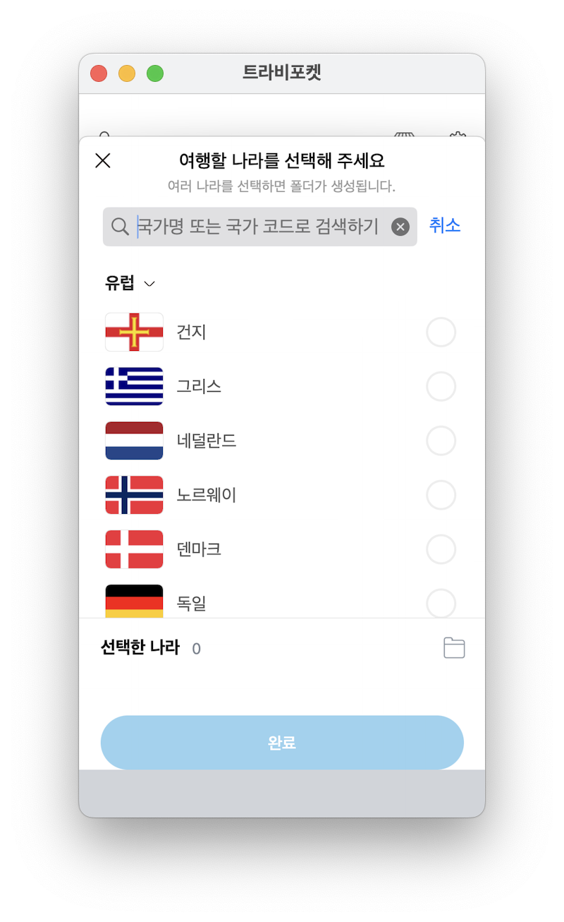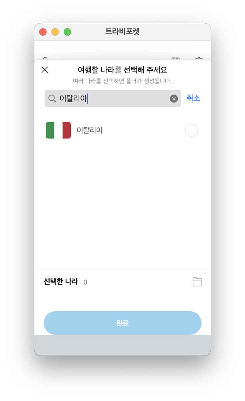 하단의 "새 여행 만들기" 클릭하여 여행할 나라를 검색 및 선택합니다. 필자는 이탈리아를 예시로 만들었습니다.