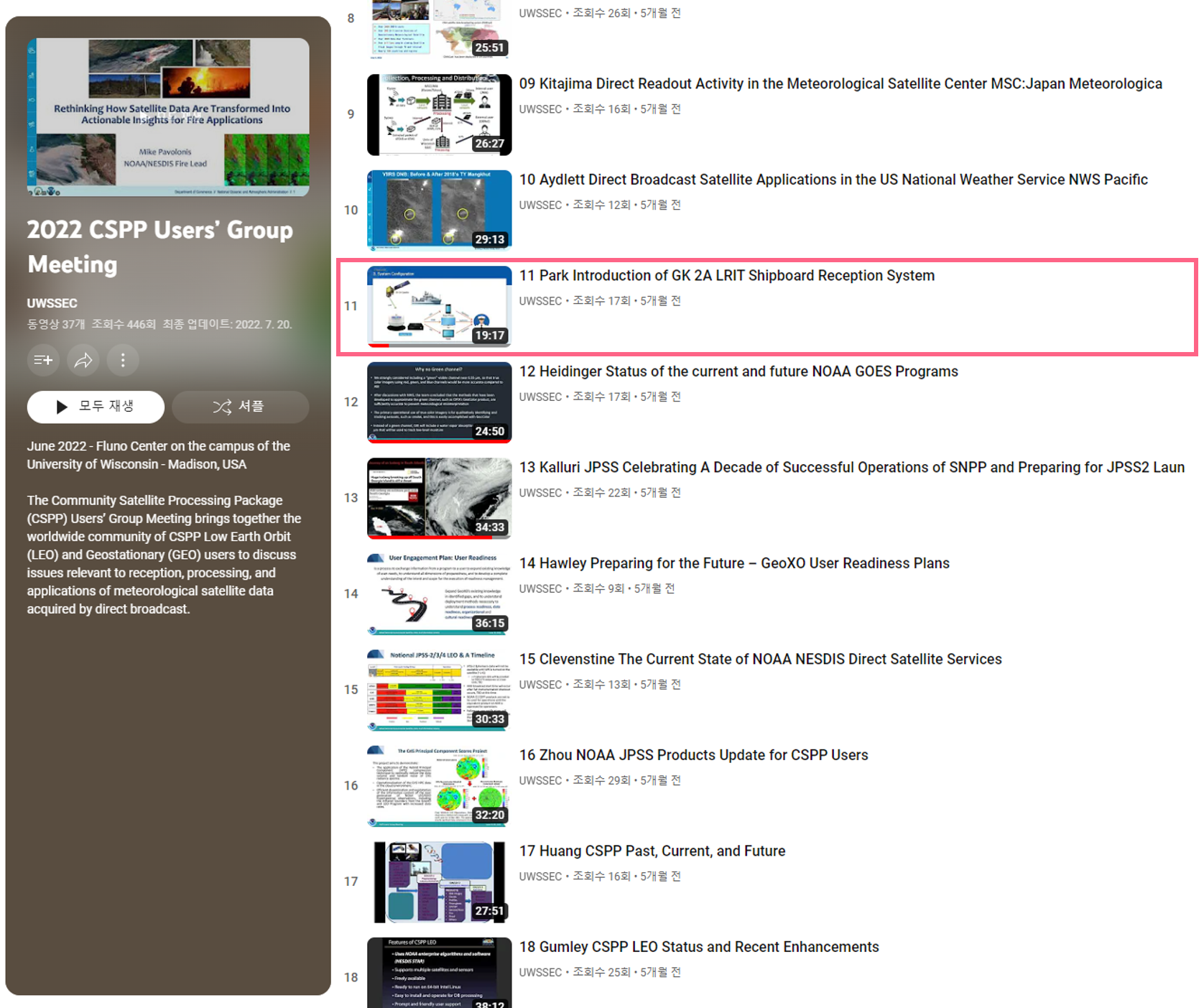 미국 Space Science and Engineering Center(이하, SSEC)는 위성 관련 협의체 Community Satellite Processing Package(이하 CSPP)을 중심으로 정기적으로 컨퍼런스를 진행하고 있습니다. 2022년에는 미국 매디슨 위스콘신 대학의 Fluno Center에서 진행되었으며, 해당 회의에는 아시아, 미국 및 중미 등의 다양한 국가의 관계자들이 참석하였습니다.