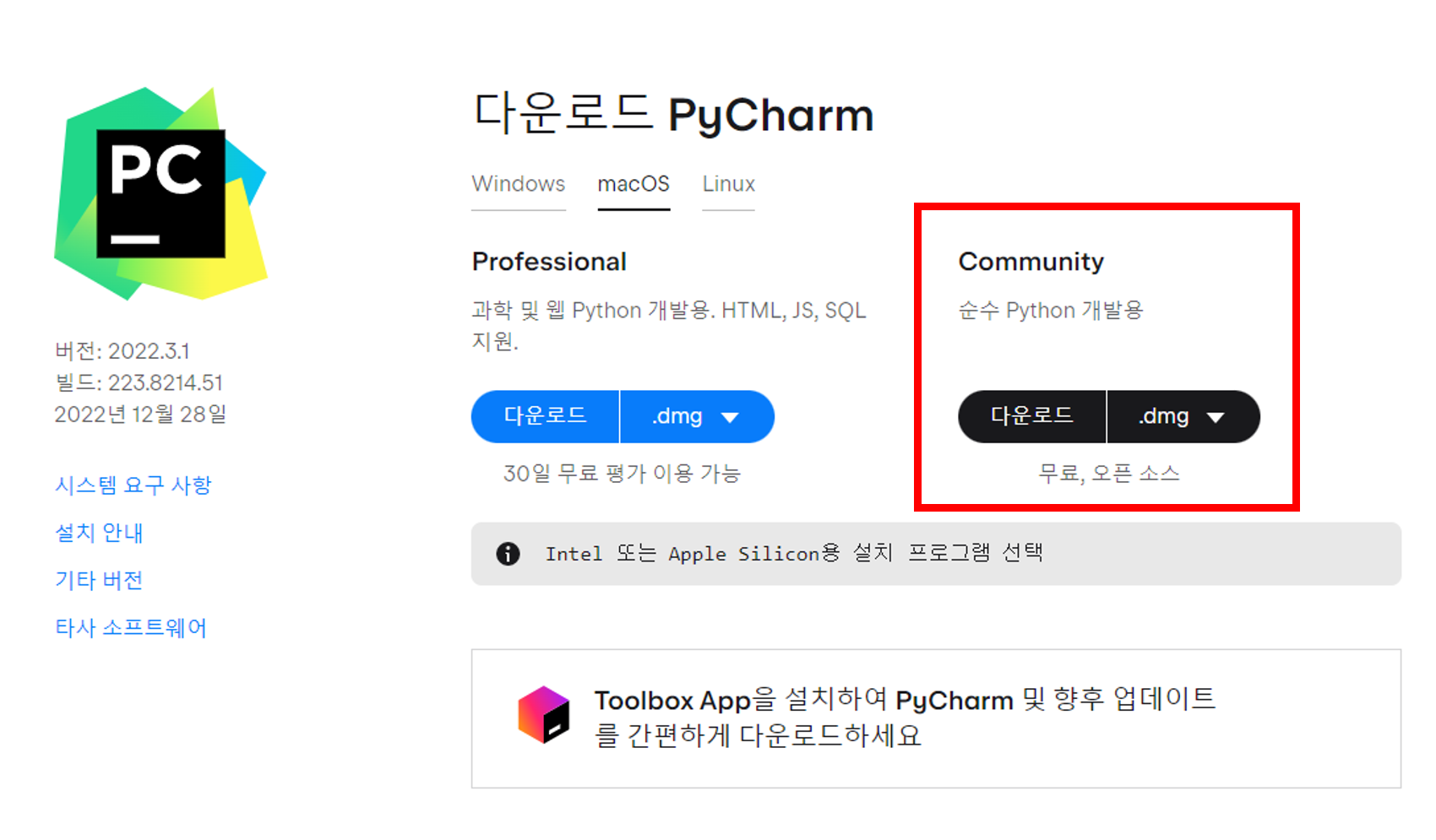 - PyCharm macOS - https://www.jetbrains.com/ko-kr/pycharm/download/#section=mac