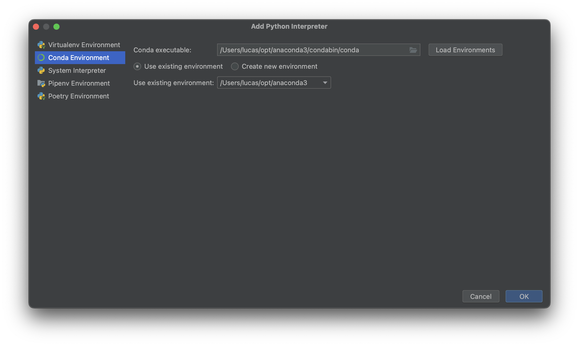 - Conda Environment > Use existing environment