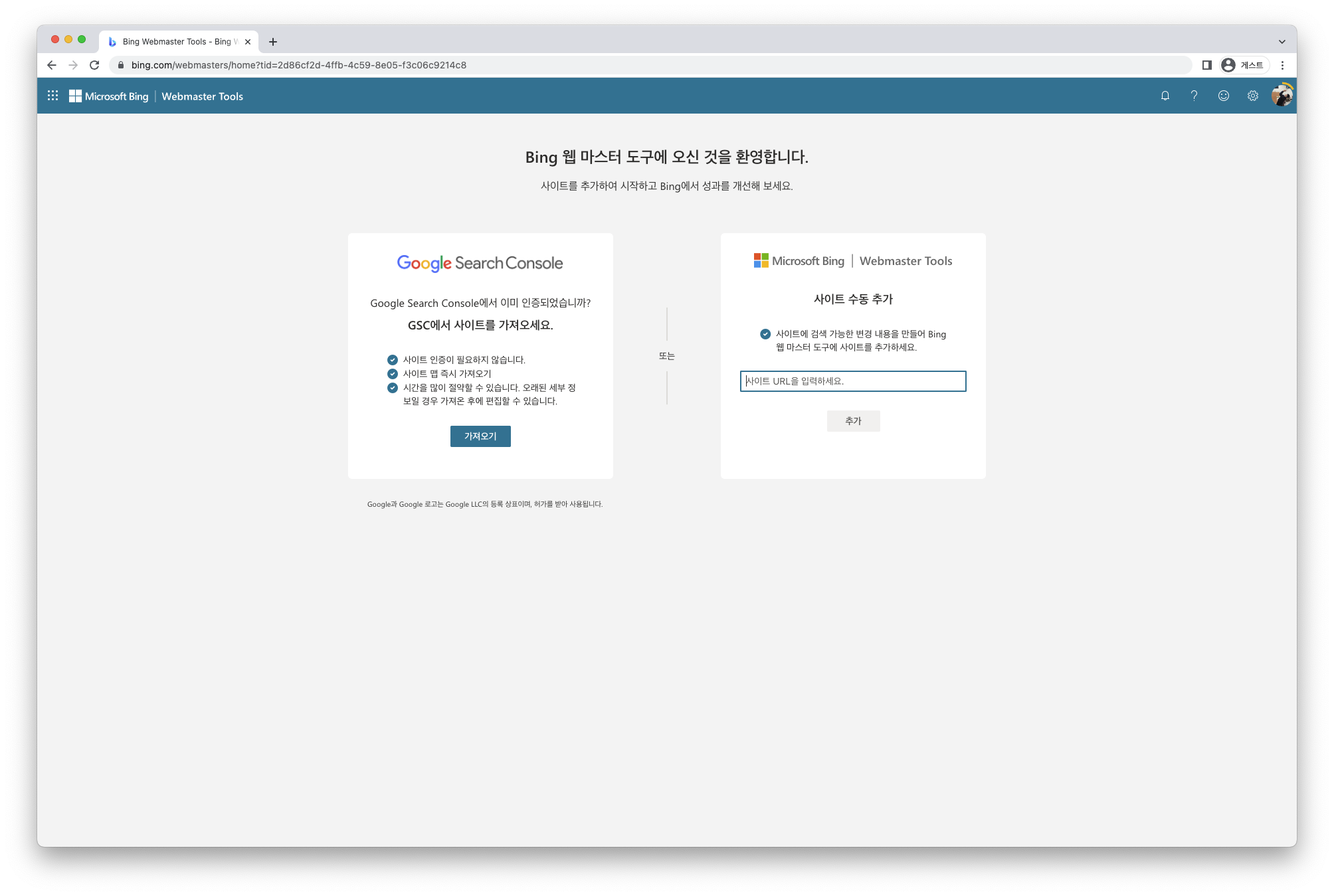 우선, bing 웹마스터는 수동으로 올릴수도 있지만, 구글서치콘솔을 등록하면 훨씬 수월합니다.