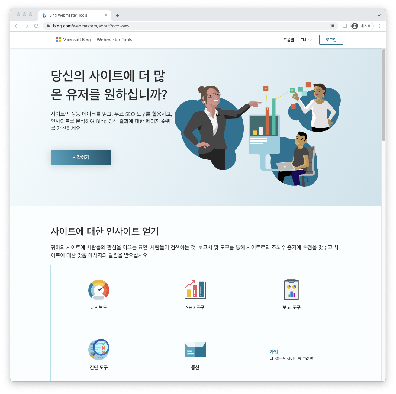 - Bing webmaster tool 사이트에서 중앙의 "시작하기" 버튼을 클릭합니다.