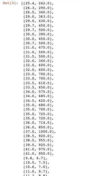 fish_data = [[l, w] for l, w in zip(fish_length, fish_weight)]