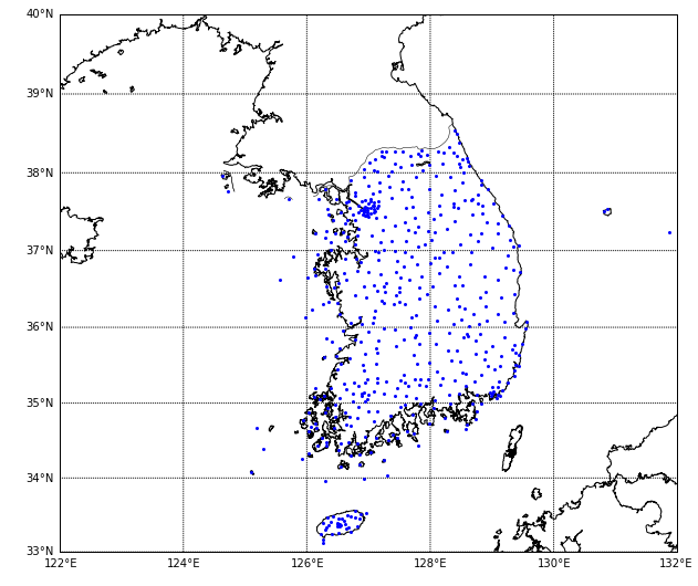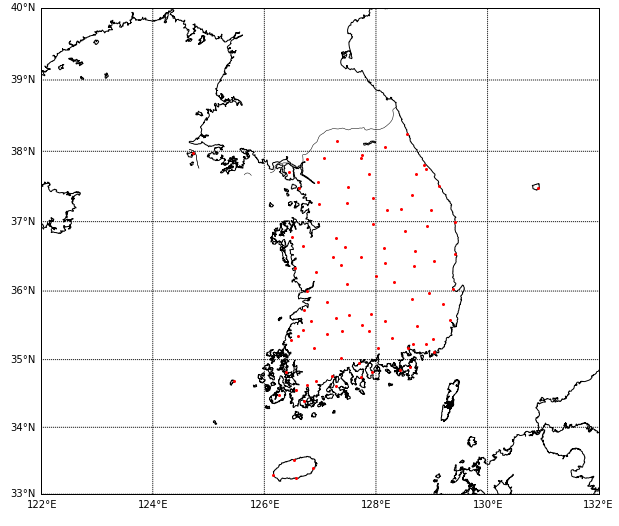 Basemap는 다양한 projection 지원 하지만, 한반도의 기상관측지점을 효과적으로 표현하기위해 다른 프로젝션 사용