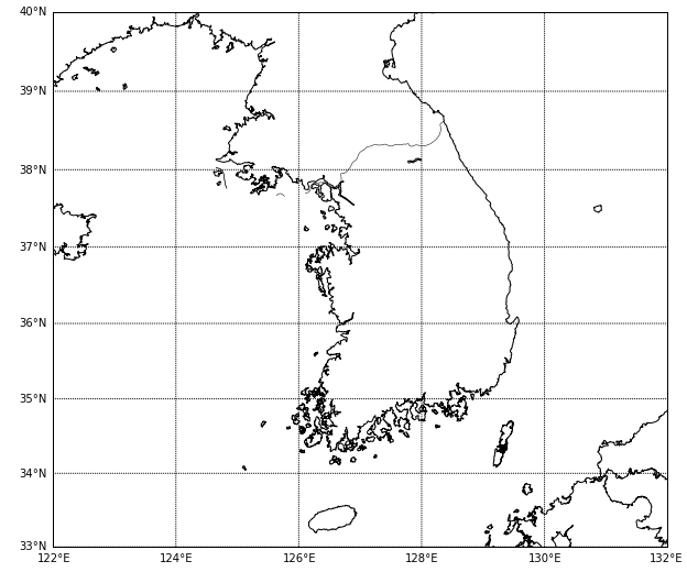 urcrnrlat=40, llcrnrlat=33, llcrnrlon=122, urcrnrlon=132)