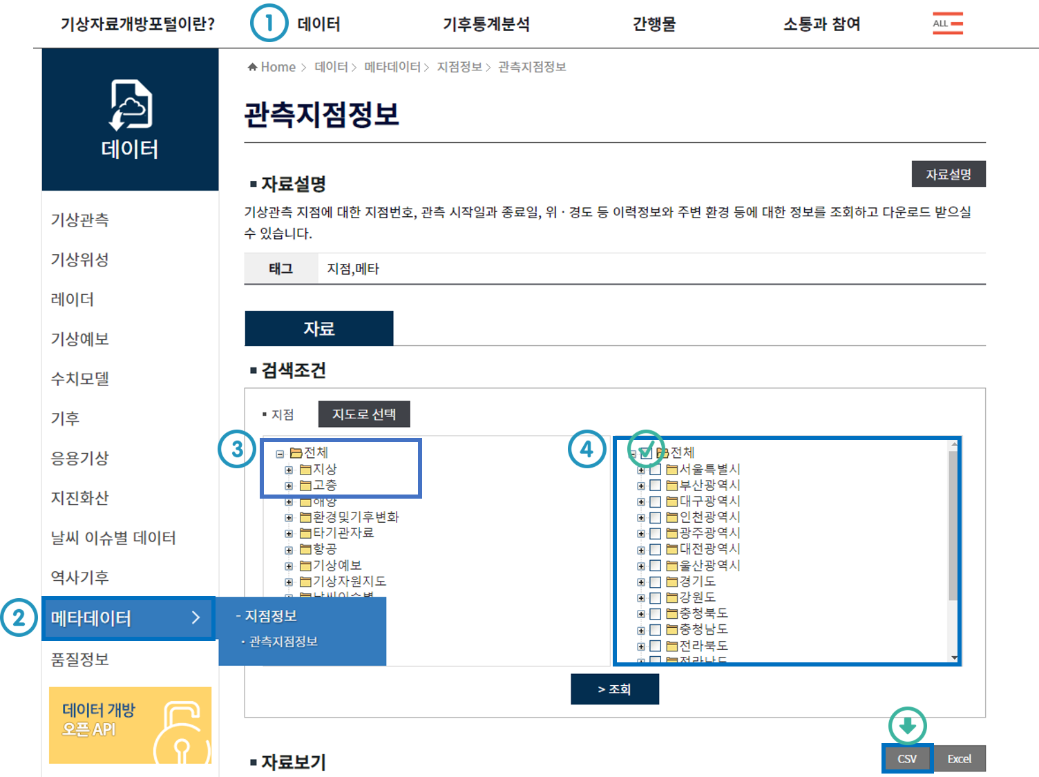 기상자료개방포털 ▶ 데이터 ▶ 메타데이터 ▶ 관측지점정보