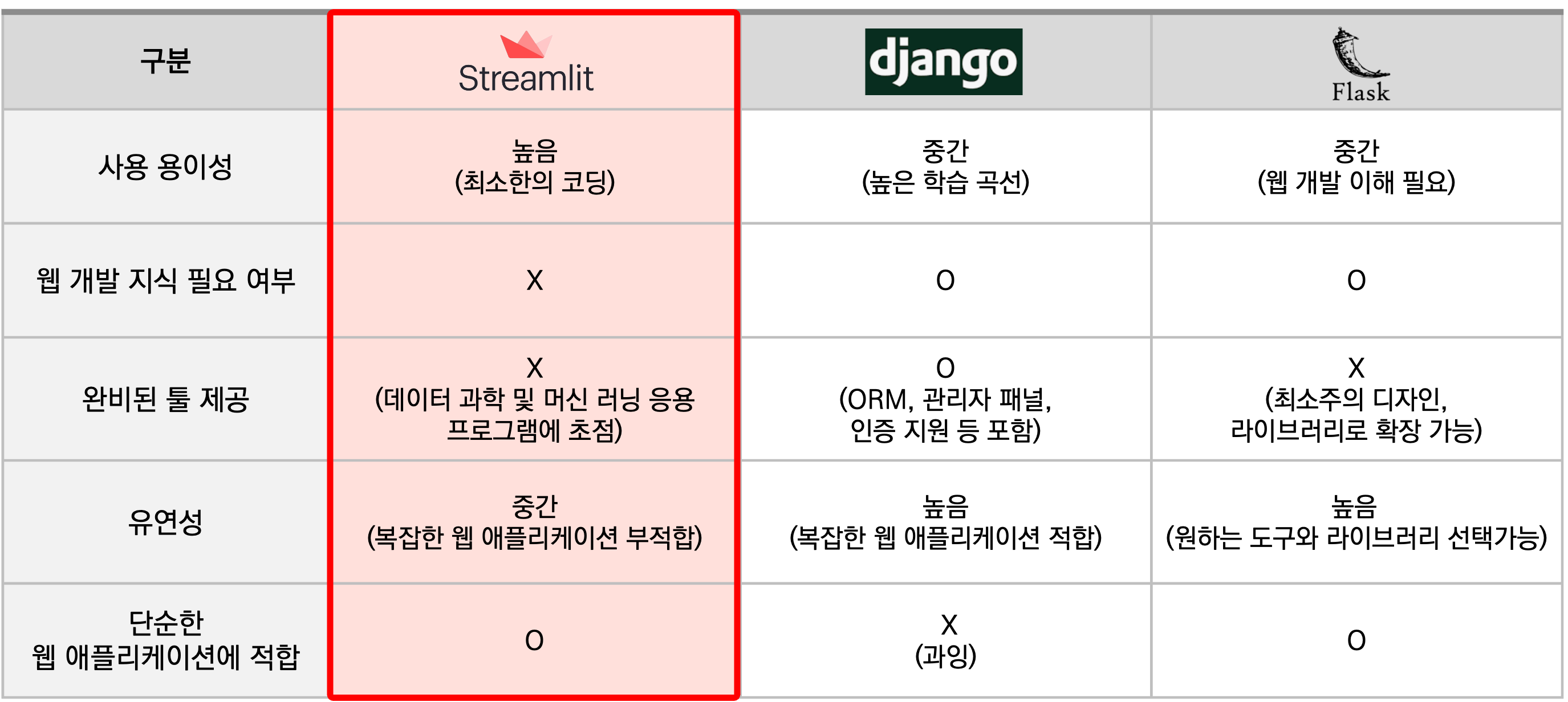 즉, 사용용도에 따라서 단순한 웹 애플리케이션을 생성하는 경우 streamlit이 합리적이며, 대규모 배포의 경우에는 다른 프레임워크가 적합할 수 있으므로 용도에 따라서 선택하여 활용이 필요합니다.