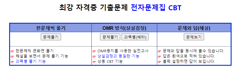 (https://www.comcbt.com/cbt/index2.php?hack_number=29) - 한문제씩 풀기 / OMR방식 / 문제와 답 방식으로 자신의 원하는 방식으로 문제들을 풀수있다.