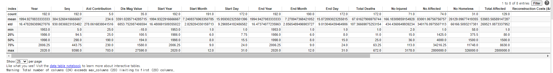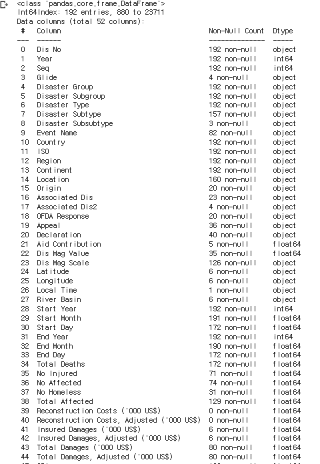 원본데이터는 전 세계의 재해정보를 모두 포함하고 있으나, 제가 관심가지는 국가(한국, KOR) 정보만 추출하도록 하겠습니다. .info()를 통해서 데이터의 개수 및 데이터타입을 확인할 수 있습니다. 또한, .describe()를 통해 기본적인 4분위값, 평균, 편차값 등을 손쉽게 확인이 가능합니다.