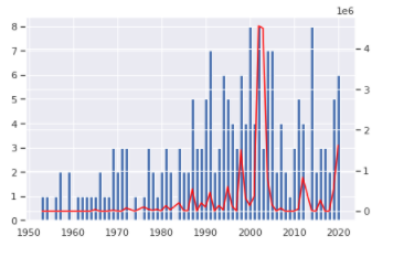 ax2.plot(KOR_summary['Year'],KOR_summary["Total Damages ('000 US$)"], color= 'red')
