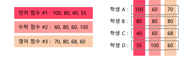 만약 3과목(언어, 수학, 영어)시험결과를 과목별로 4명의 학생(A,B,C,D) 순서대로 값을 가지고 있는 리스트가 있다고 해봅시다. 하지만, 과목의 평균이 아닌, 학생별 평균이 궁금해서 데이터셋을 변경하려고 한다면 어떻게 할 수 있을까요? 값이 많지않으니 단순하게 직접 값을 이동해서 평균을 구해볼 수 있을 수 있습니다. 하지만, 학생수가 4명이 아니라 100명이라면, 또는 과목이 3개 아닌 더 많은 과목이라면 여러분은 이를 쉽게 계산할 수 있을까요?