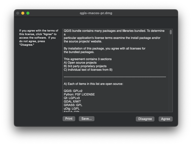 QGIS bundle는 다양한 패키쥐와 라이브러리 설치되어있다보니, 각각의 app 라이센스 정책에 따라 적용되며, 이를 모두 동의하냐는 내용의 문구가 나옵니다. "Agree[동의]"을 통해서 설치를 진행합니다.