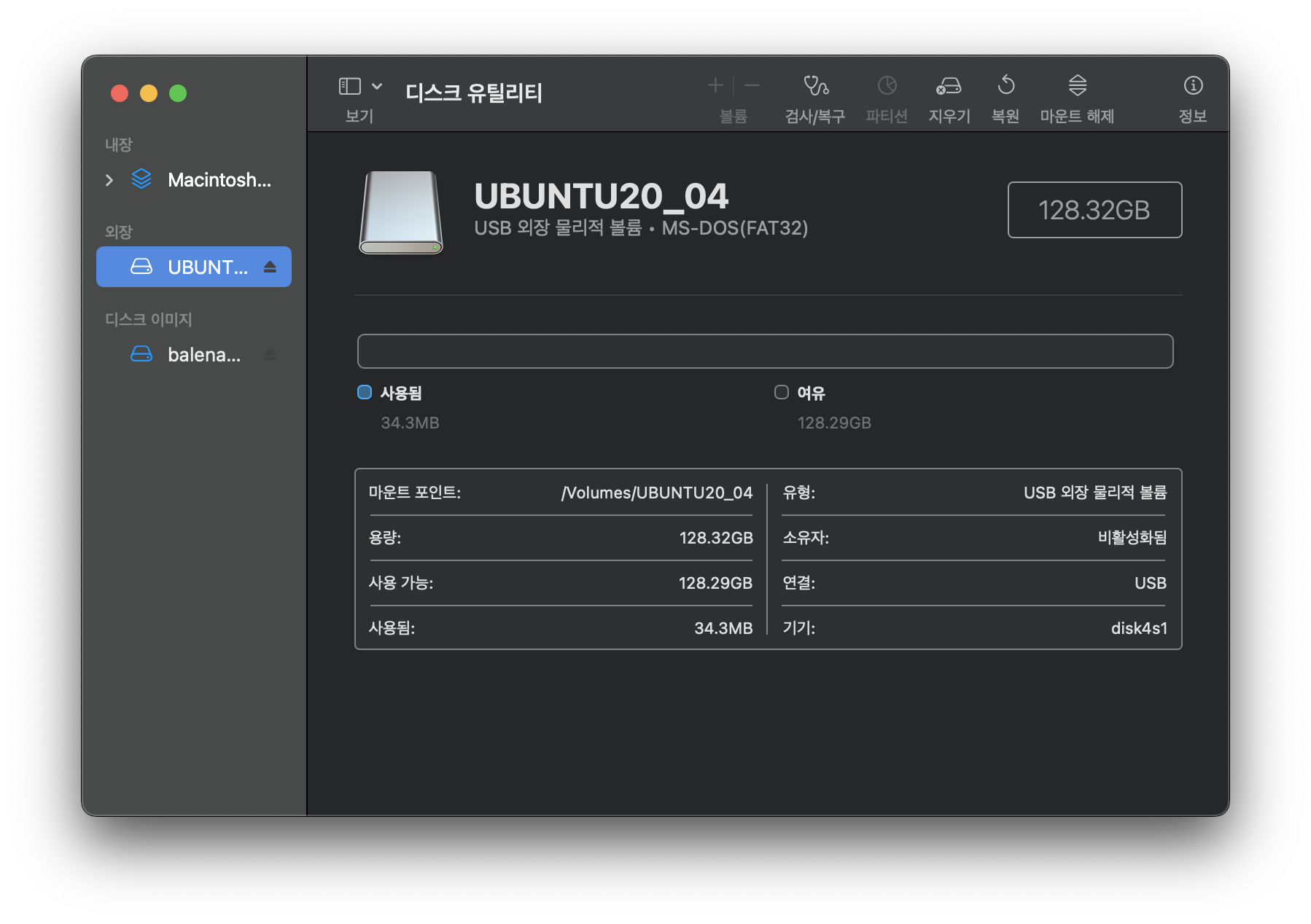 연결된 USB명을 편의상 'UBUNTU20_04'로 변경하였습니다. 이후, 지우기 버튼을 클릭하여 속성을 변경해 줍니다.